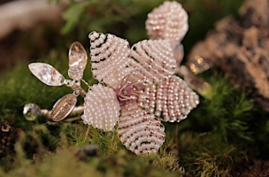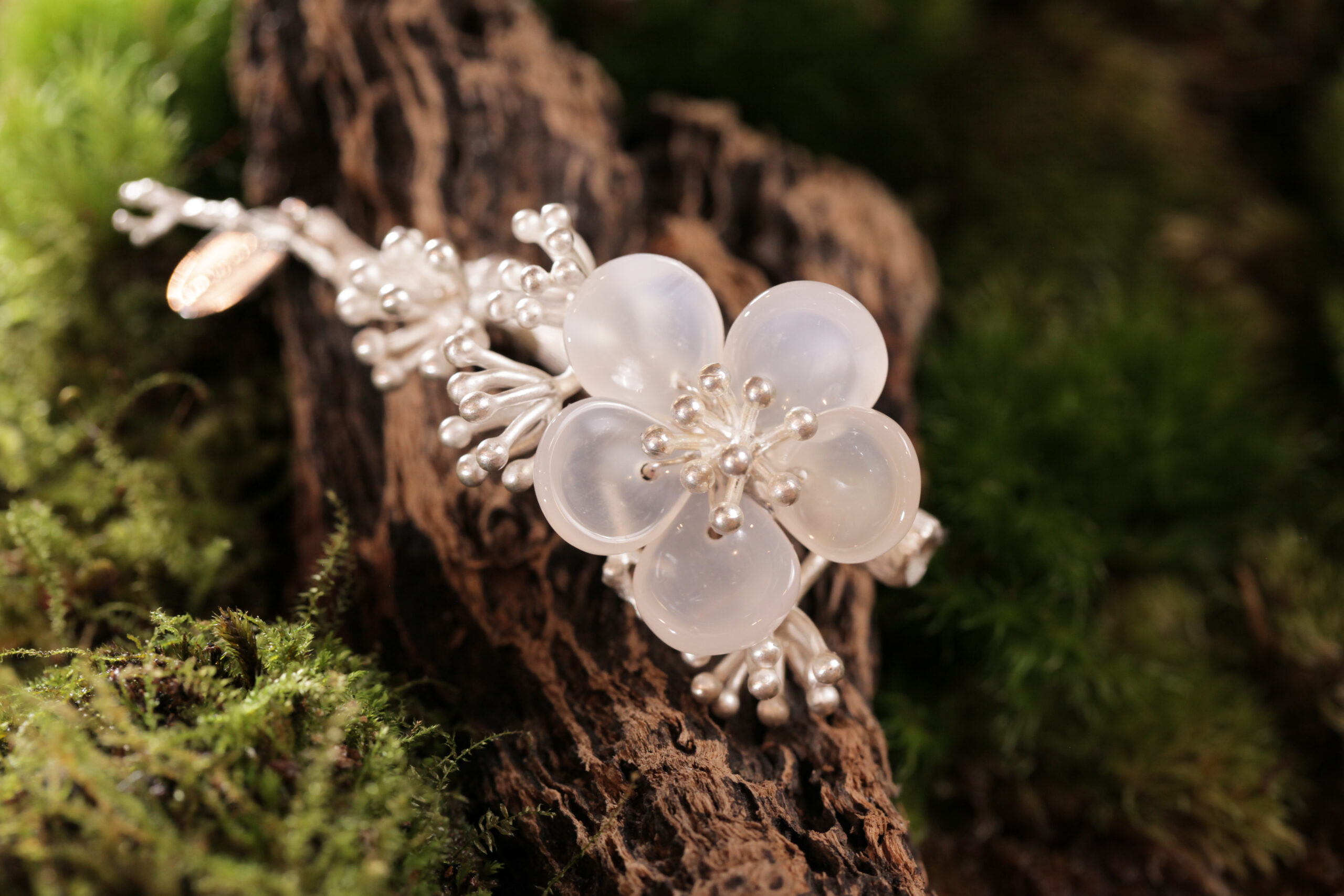 數位雕塑銀冰珠的冬梅在枯枝上朵朵盛開,如白雪般清透搖曳著古意,在冷傲的模樣中、點綴出柔美且堅毅的姿態。以淺嫩的白皙琉璃冰珠作為梅花含苞待放的展現,微透的琉璃配上銀珠的花蕊搭配,更是讓這象徵著不屈不撓精神的梅枝更添詩意與優雅。