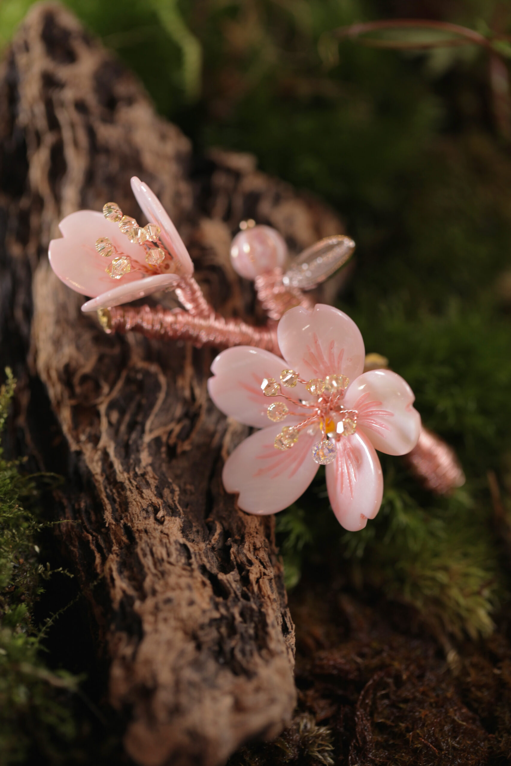 「欲問大和魂,朝陽底下看山櫻」除了愛情與希望,櫻花更「有熱烈的生命、高尚、純潔」等含義,在花語所構成的無聲交流裡,更賦予了滿開著的祝福。採用手工雕刻的貝殼花瓣作為盛開的櫻花型,以白黃水晶作為花蕊,編織成了一朵朵綻放著熱烈與純潔的櫻花。