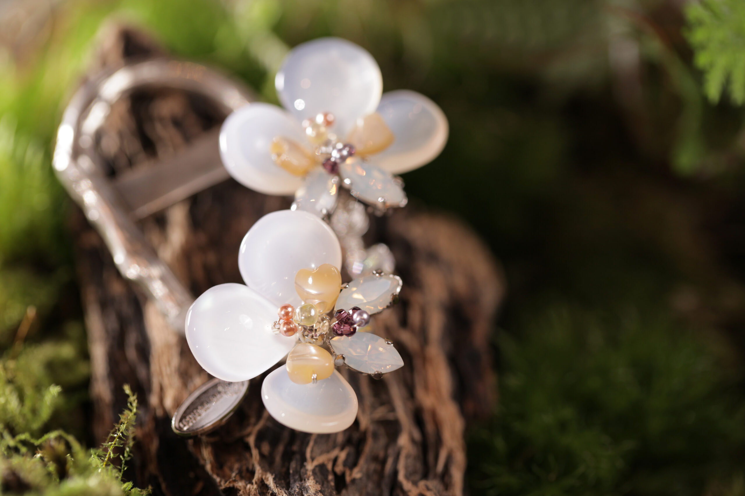 3mm細緻銀線勾勒出紫薇花型浪漫波浪型,結合日本水晶造花液製作出花朵漸層暈染風貌,花蕊點綴月光石與粉色天然珍珠,營造出紫薇花朵輕盈柔美姿態。