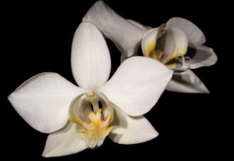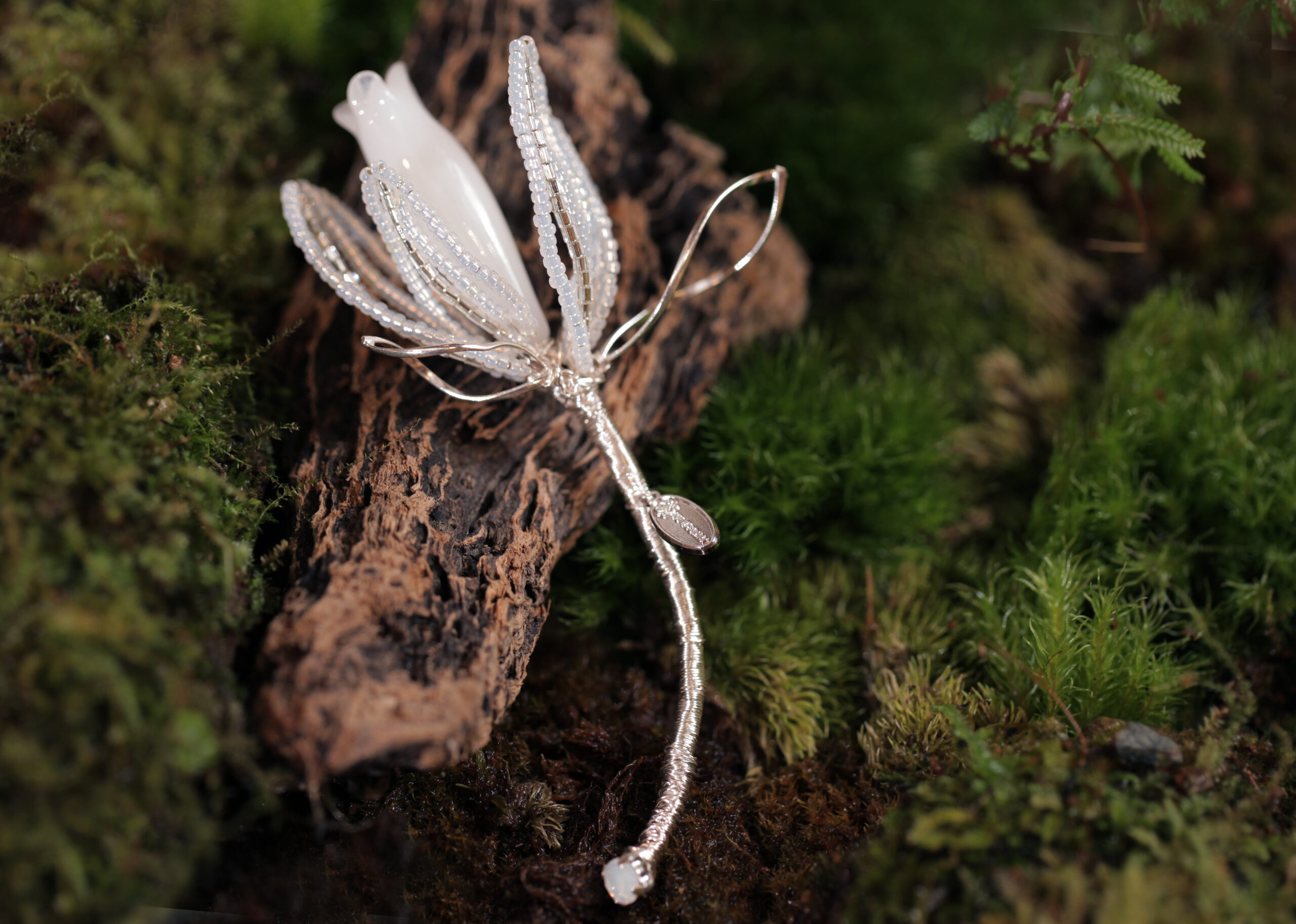 蝴蝶蘭並非一叢錦簇的花卉,而是將己身的身形綻放開來,如同翩翩飛舞的蝴蝶停駐在細膩的枝椏上。以鍍銀銅線揉合珍珠母貝,鋯石、施華洛水晶作為飾品的層次點綴,讓珍珠母貝本身的柔美光澤更結合了奪目的表徵。
