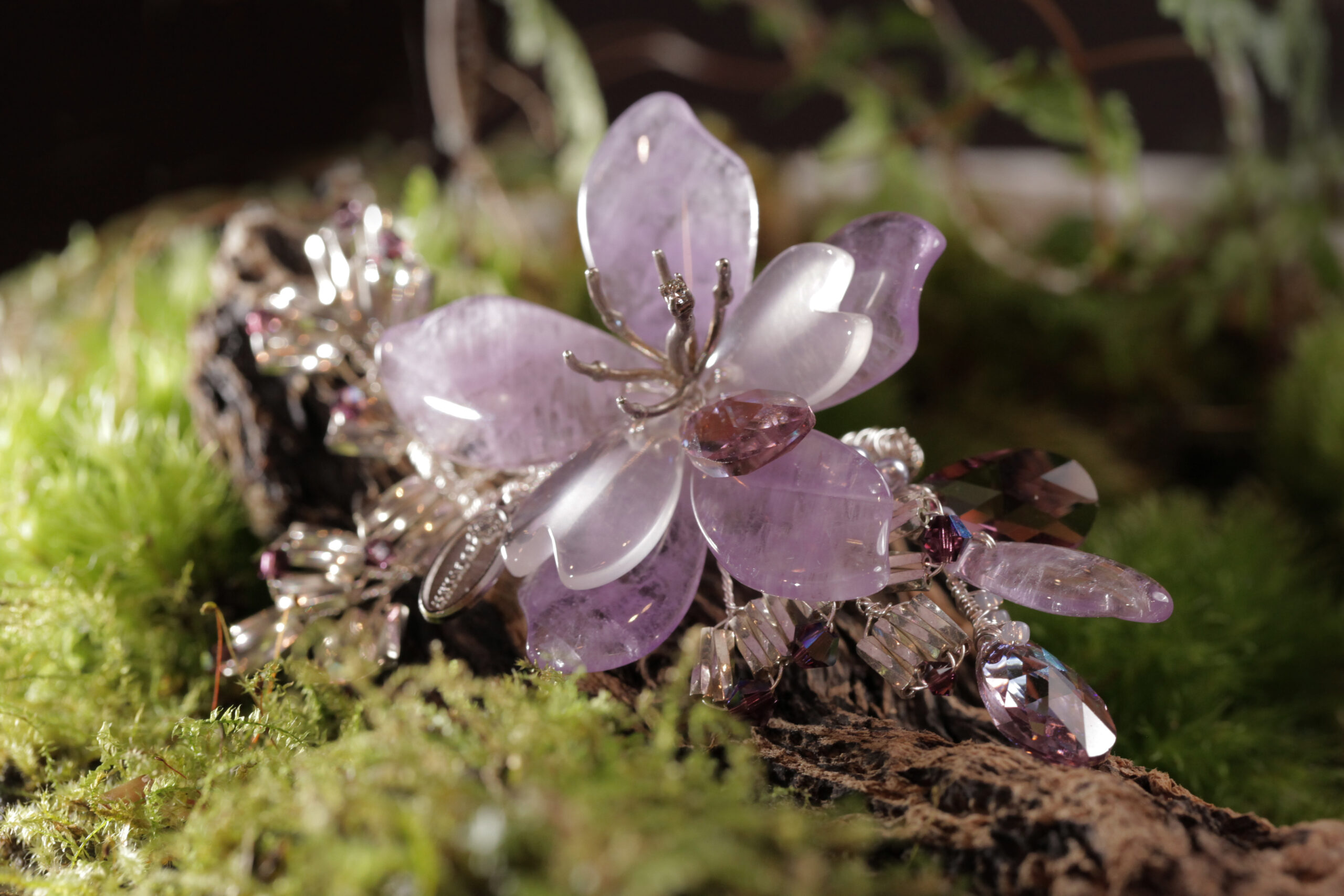 選用深淺天然紫水晶花瓣詮釋艷紫荊花朵龍骨瓣紫紅色條紋特色,銀管珠編織葉烘托立體花型姿態,趁著暖陽迎著光,綻放光彩。