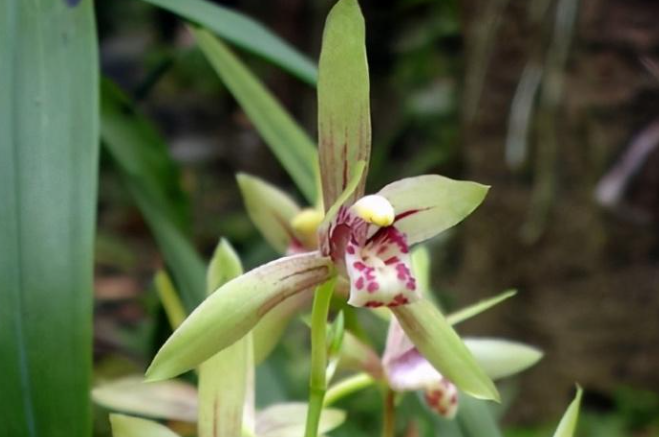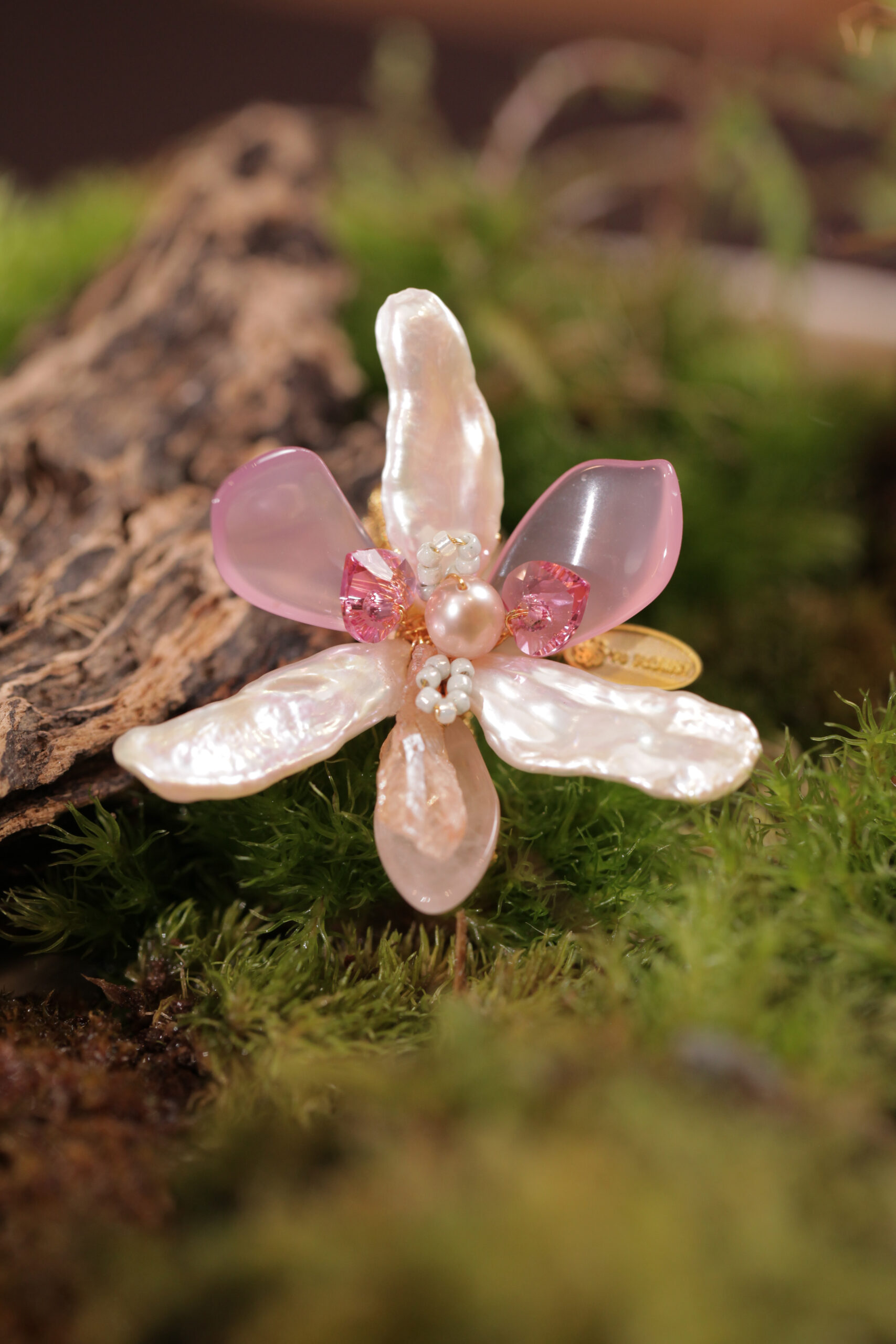 國蘭姿態優雅,花朵具特殊的香氣,被譽為「王者之香」,自古就為國人所喜愛,並與梅、竹、菊合稱「四君子」。使用天然珍珠與粉晶花呈現兩性花特性,花冠由3枚萼片與3枚花瓣及蕊柱複合媒材搭配組成創作。