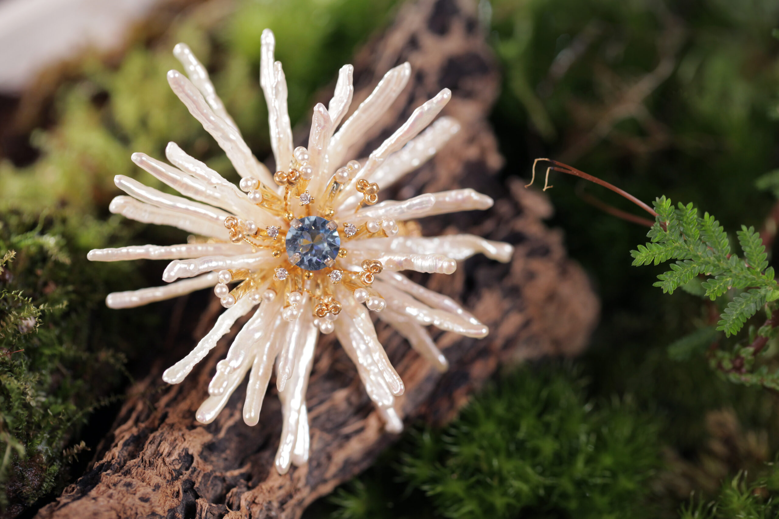 天然淡水珍珠的花瓣,似潔白碧玉,細碎卻豐厚。藍色托帕石被細小日本珠包圍著襯托著,更顯得蕊寒香冷,有種凌霜傲雪的倔強,搖曳着季節,只爲絢爛的生命而綻放。