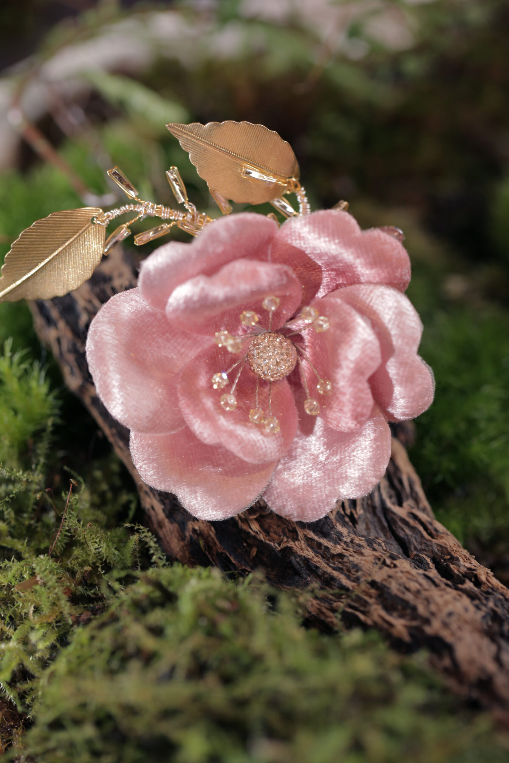 柔滑的絲絨布片片裁切燙製,手工上漿碩型使平板的面料別緻立挺,中心使用銅線編織的水晶珠蕊,可靈活調整花蕊姿態,創作柔美的茶花風情。