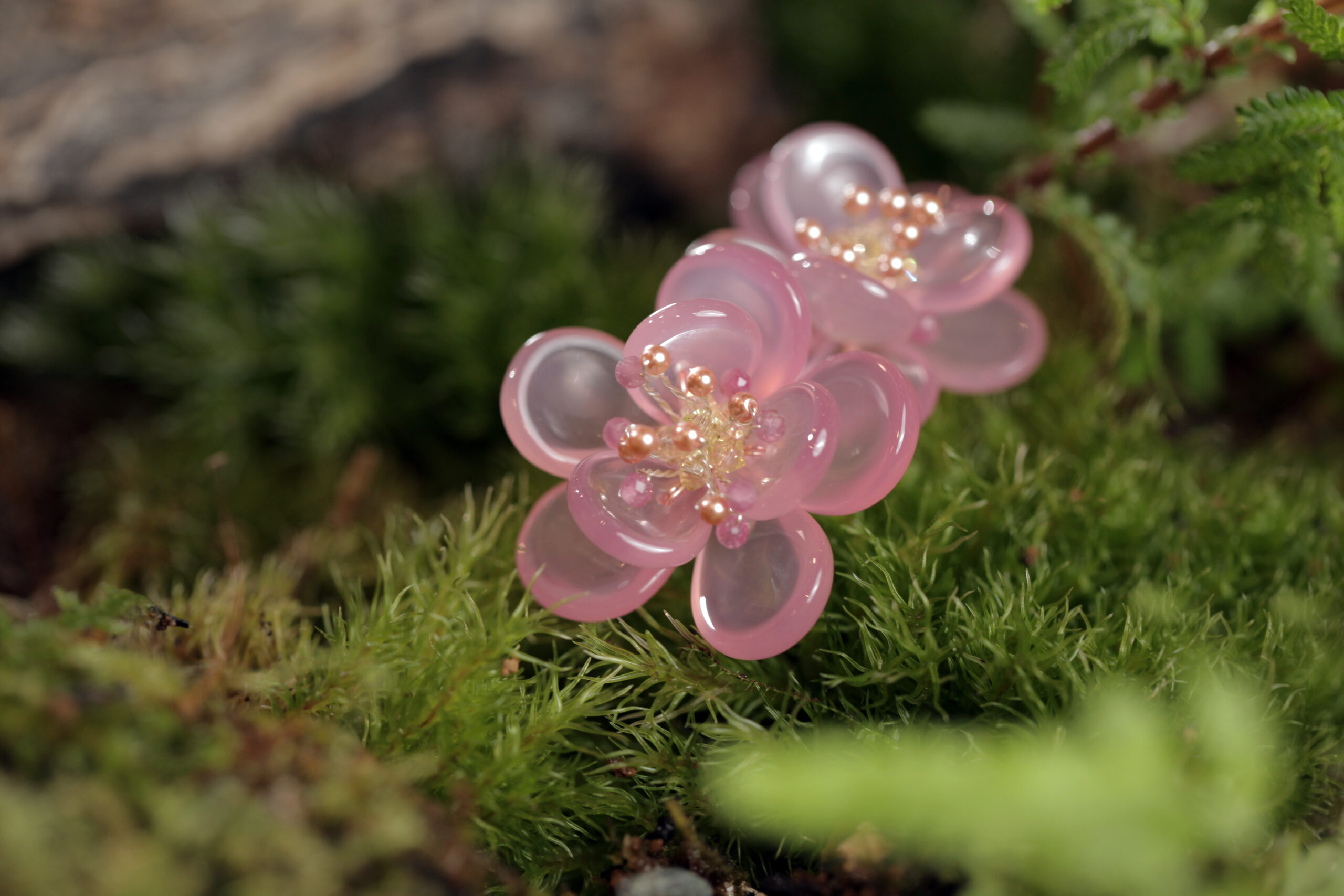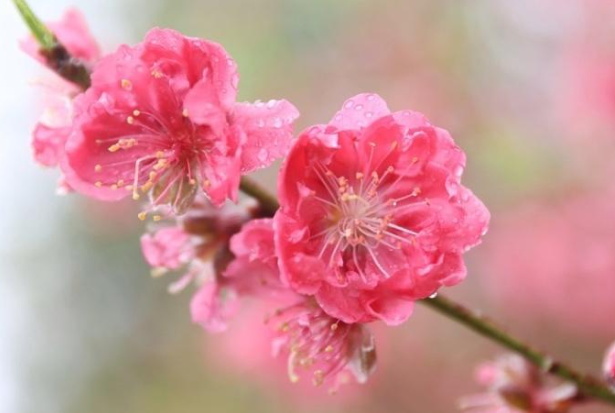 多重透彩粉晶編織製成重瓣花絲粉紅的桃花,珍珠與黃水晶模擬花柱細長,小柱頭圓頭狀。桃花在早春開放,芳華鮮美,往往成為春天來到的象徵。