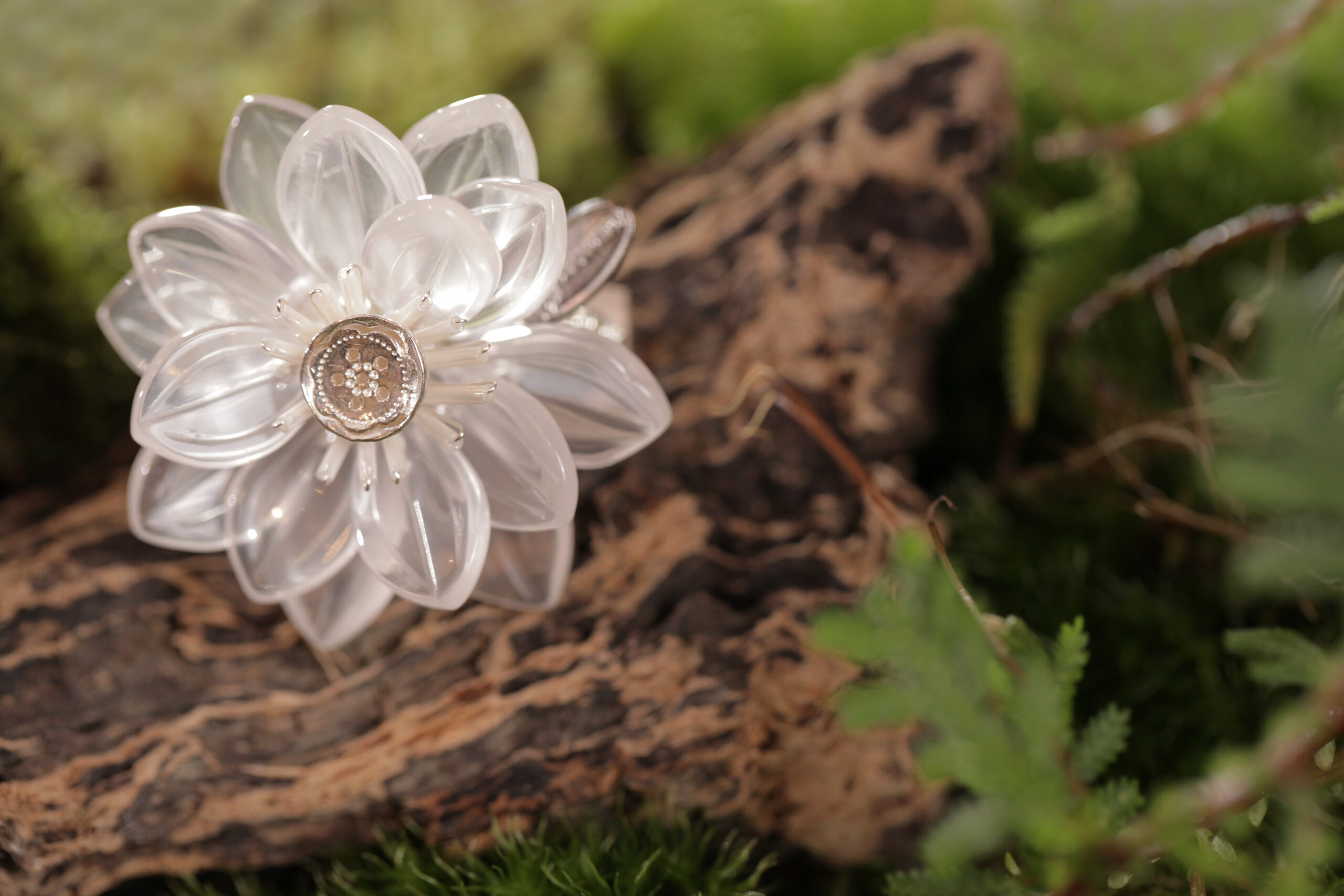 選至晶透的奧地利水晶,製作出高腳杯般構造的花被,質地如「紙花」的九重葛苞片,透過光線折射出不同的光澤,時而晶瑩潔白,時而淡黃淡綠渲染,擁著粉中透亮的珍珠花蕊,綴以翩翩琉璃綠葉,清爽雅致,風韻獨特,感受著這股堅毅不拔的美麗力量。