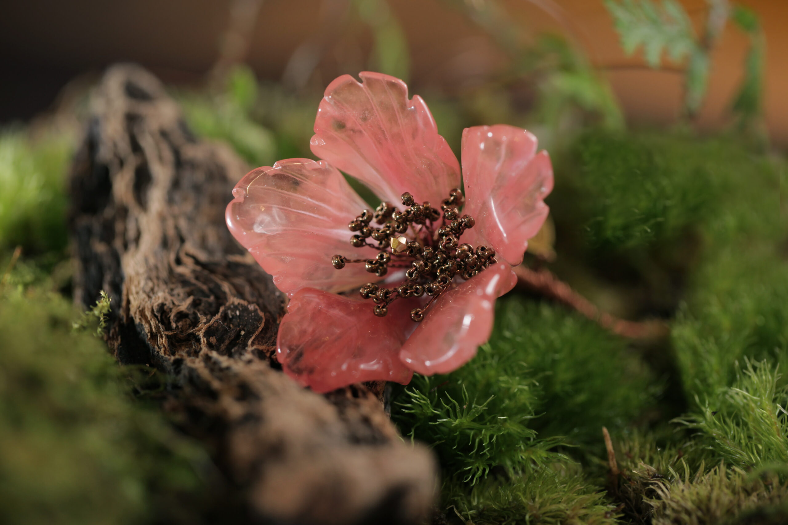 天然西瓜晶雕刻而成花瓣,弧度優美呈現自然木棉花彎曲姿態,花蕊選用古銅色進口銅珠編織成型,創作一朵嬌豔的橙紅色木棉花,象徵紅紅火火,生活的積極向上和蓬勃生機。