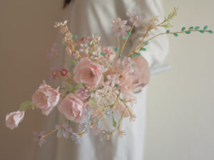 【花構印象】為已具備花藝或手作基礎者設計,帶領學員深入花朵的觀察與結構理解,從細節切入形體表現,練習如何透過手作還原植物自然綻放的生命感。課程核心聚焦於花型解構、層次重組與材質轉譯,將UV黏土、手染布、綢緞、天然寶石等複合媒材,應用於花瓣雕塑與整體立體造型中。