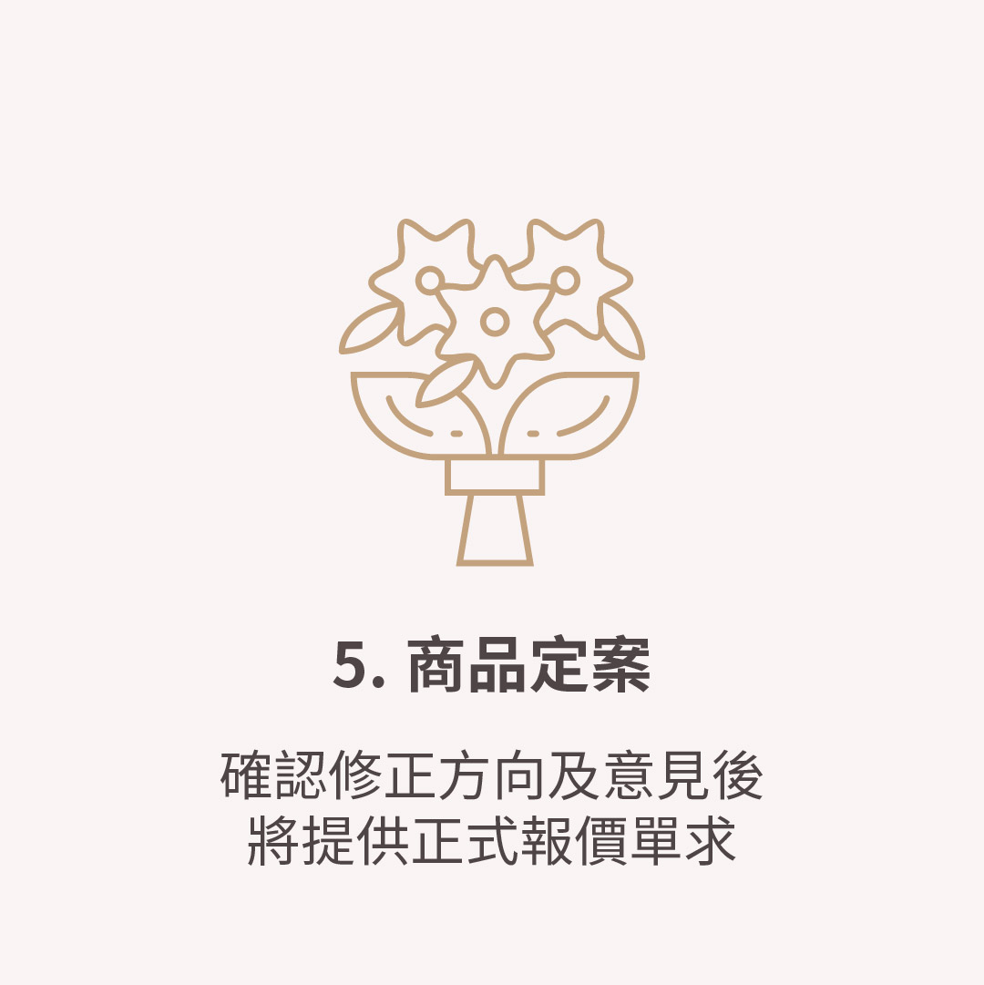 將您天馬行空的夢想畫面告訴花寓,即使無具體想法也沒有關係。 設計師會化身神仙教母滿足您的想像,為您設計一花一草搭配素材,擬出雛形樣貌提案,比草圖更能貼近真實,確認後再製作為完成品 。將「心意」化為花禮,打造全世界獨一無二的紀念。