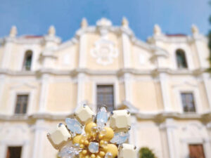 這堂課以玻璃珠、鋯石與金屬線構築花磚般的花卉結構,呈現經典與現代交織的視覺語言。