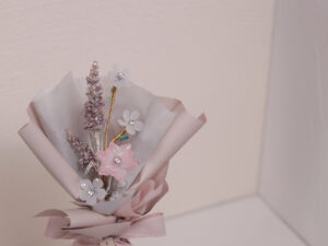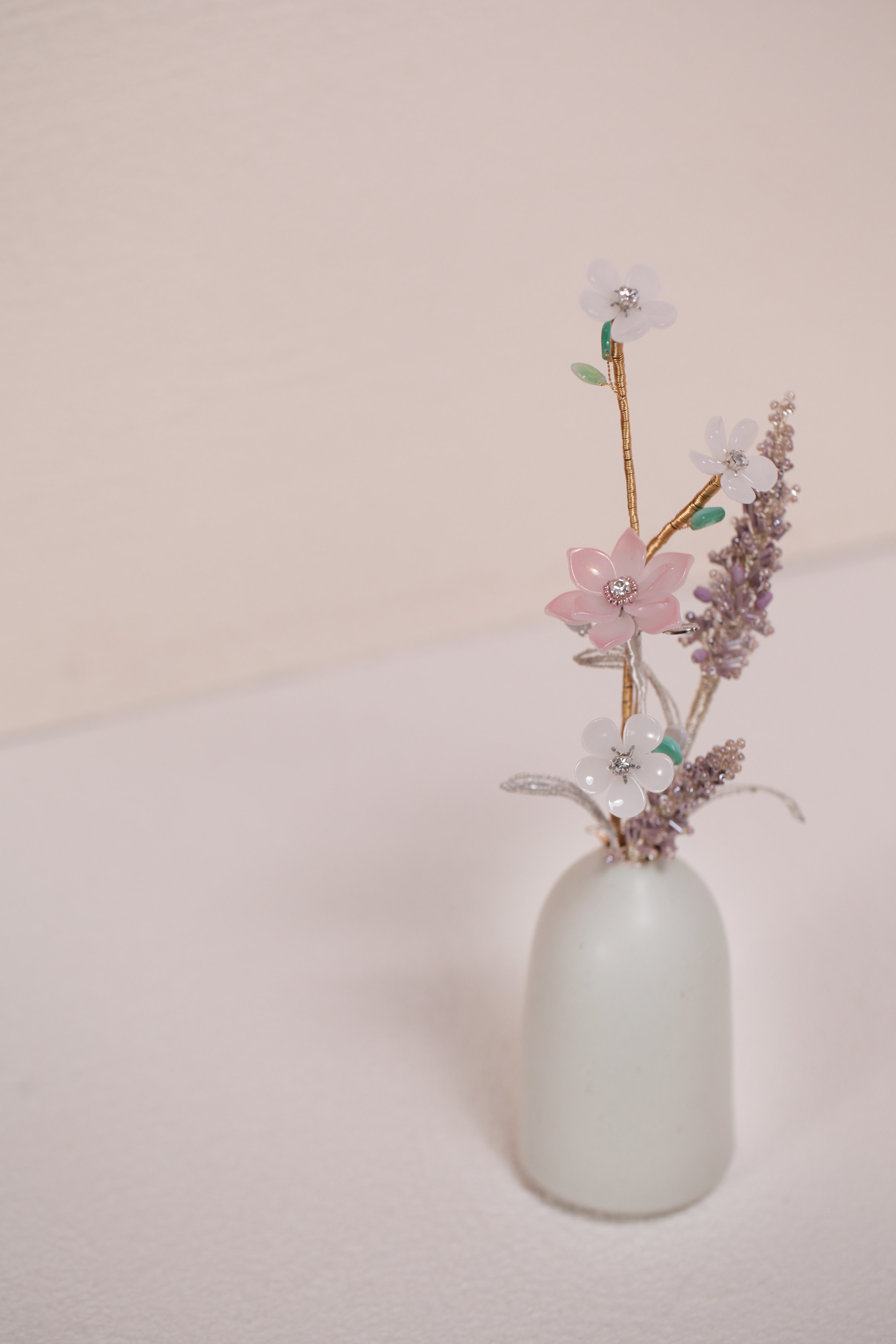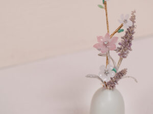 本課程運用琉璃珠與金屬線材,學習垂直花型編織技巧,打造出飽滿且層次分明的小型薰衣草花束,並教導實用的包裝與構圖技法,讓作品兼具視覺美感與實用性。