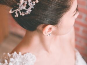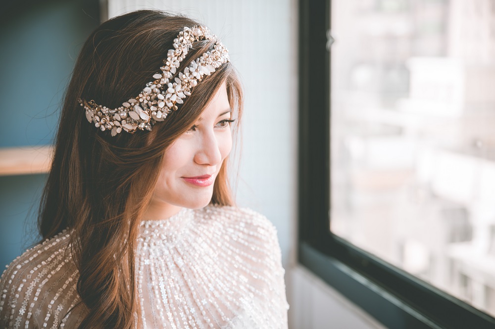 The piece arches gracefully across an updo or low bun, flattering the bride’s face and hairstyle with refined balance.