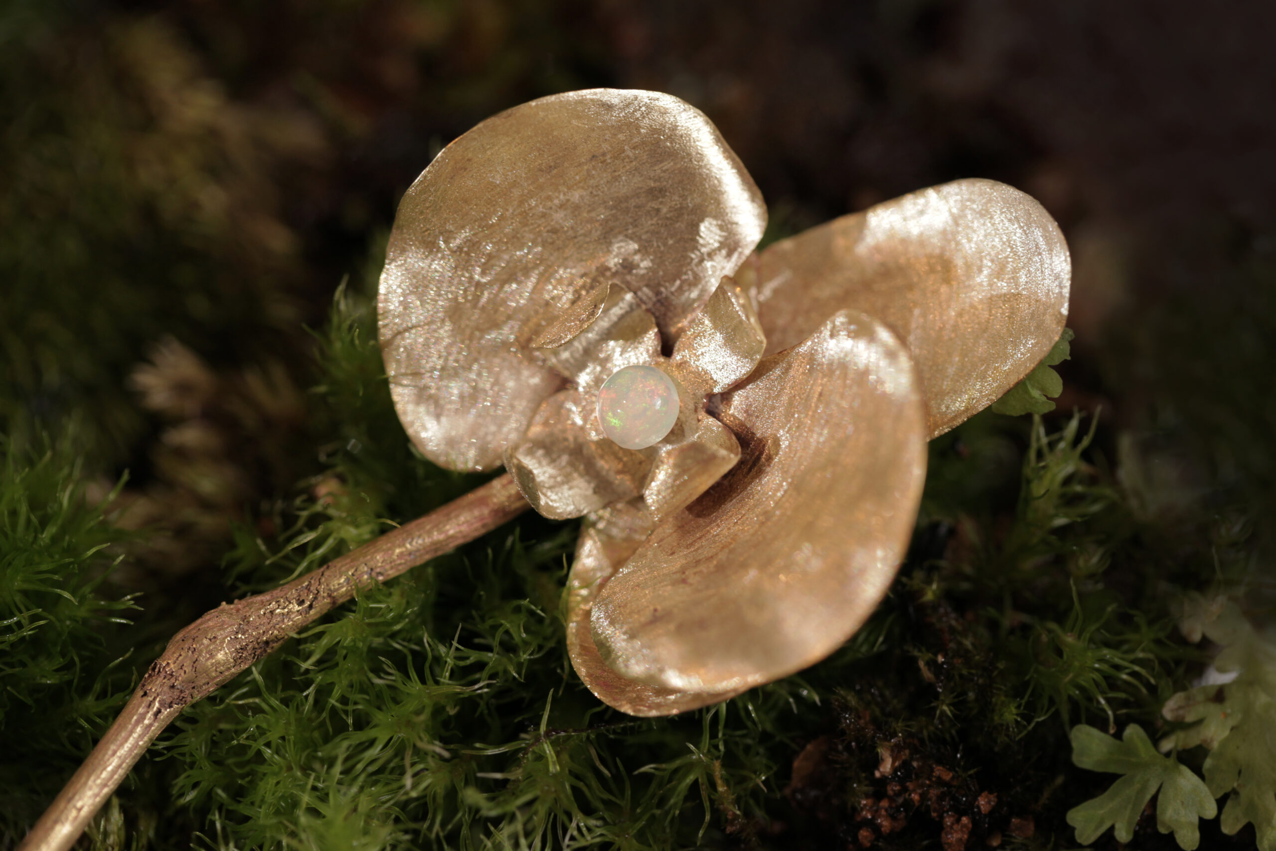At its center lies a fire opal, shimmering with iridescence that shifts with light and movement. The surrounding petals are sculpted from hand-hammered brass, forming soft curves that reflect the organic silhouette of blooming orchid wings. The detailing is minimal yet intentional, focusing on fluid contours rather than excessive embellishment. Every fold and line is crafted to evoke natural grace, balanced with contemporary polish.