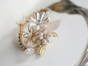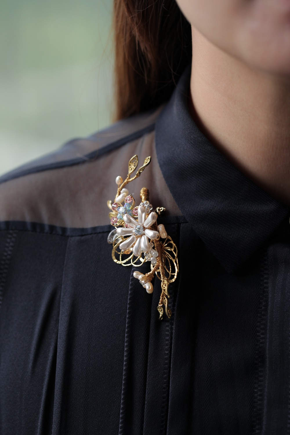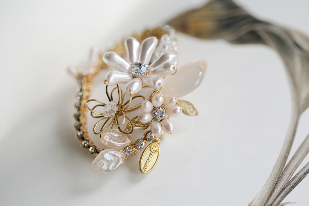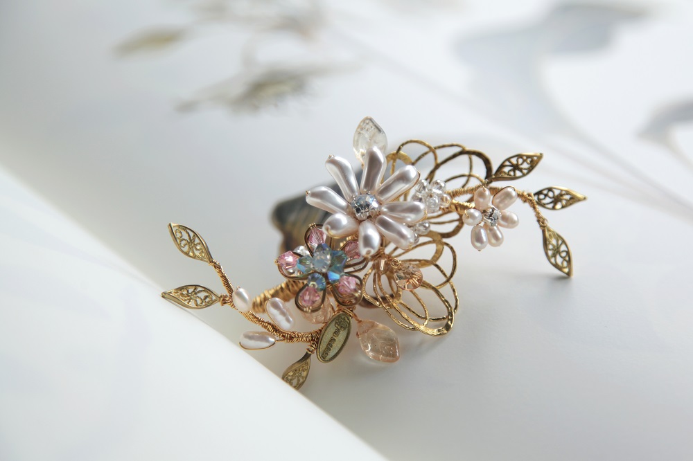 選用巴洛克珍珠、水晶、貝珠與黃銅金屬葉片,由設計師一針一線、純手工纏繞而成,形態細膩、生動靈巧。