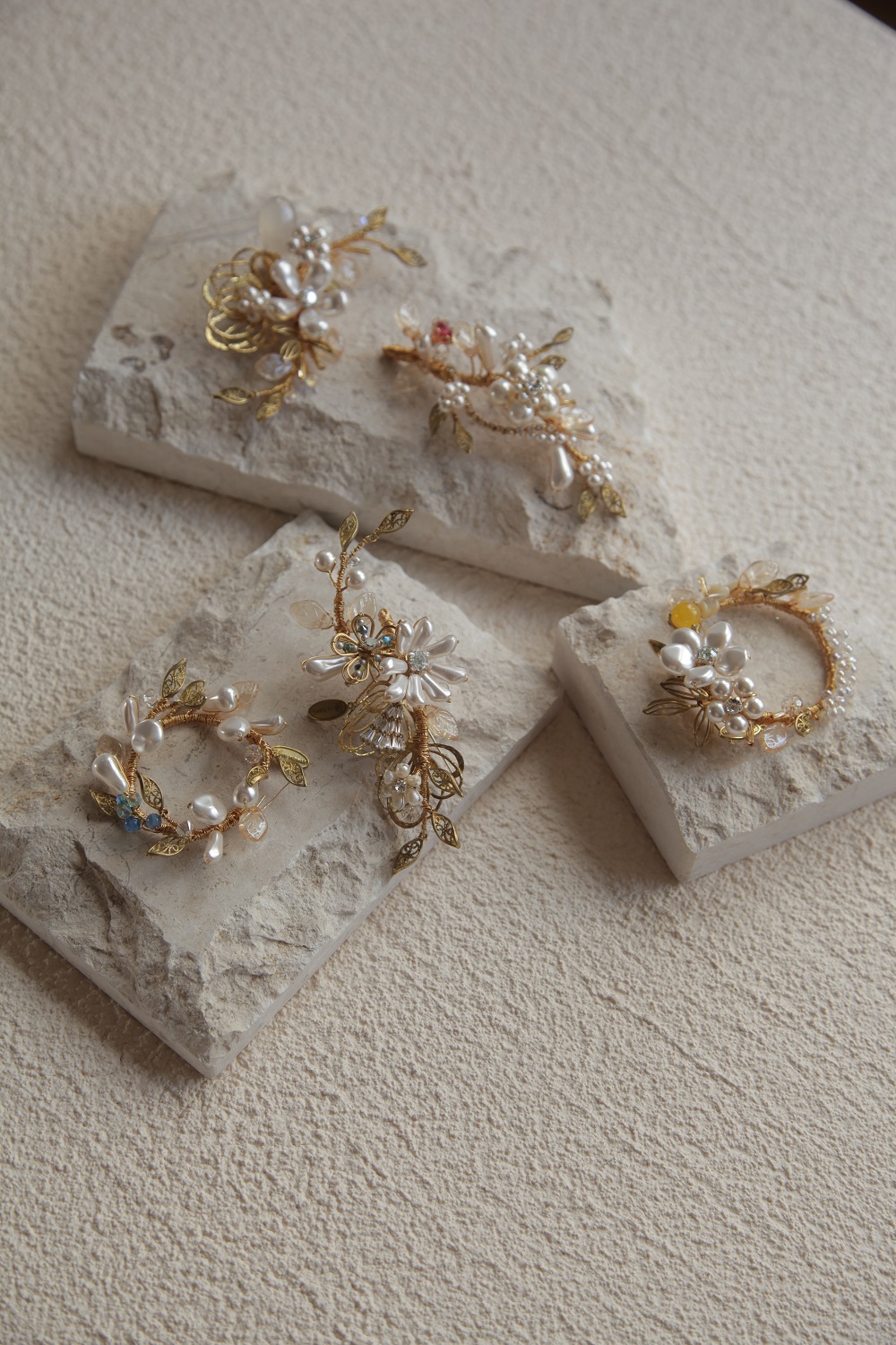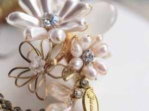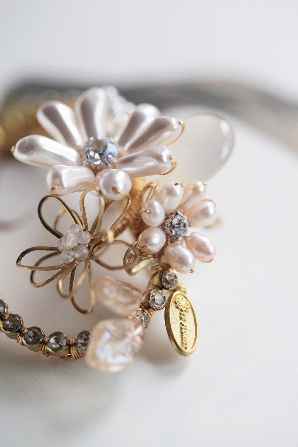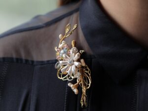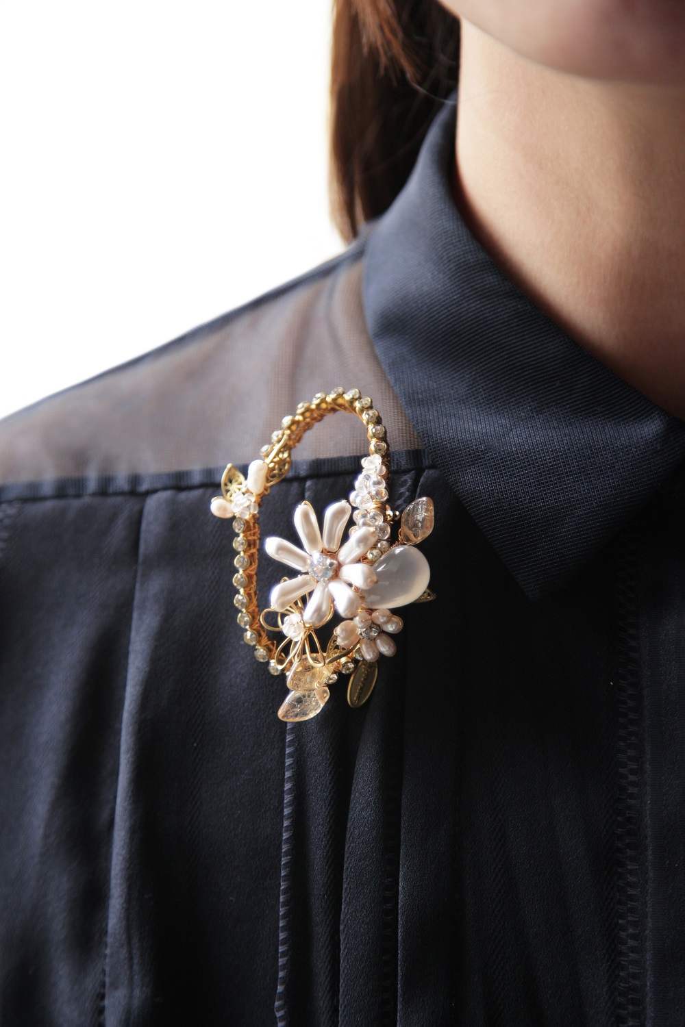 選用巴洛克珍珠、水晶、貝珠與黃銅金屬葉片,由設計師一針一線、純手工纏繞而成,形態細膩、生動靈巧。